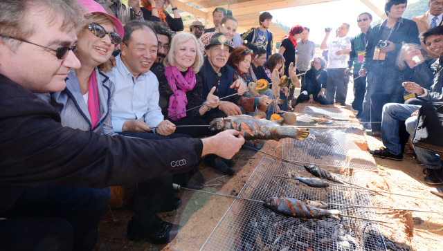 제2회 완주 와일드푸드축제 개막을 하루 앞둔 11일 고산 자연휴양림에서 '이코리아 전북비엔날레' 참여 외국 작가들이 임정엽 완주군수와 함께 화덕체험장에서 물고기를 구워먹으며 즐거워하고 있다. 이번 축제는 12일 개막식을 시작으로 14일까지 3일 동안 열린다.