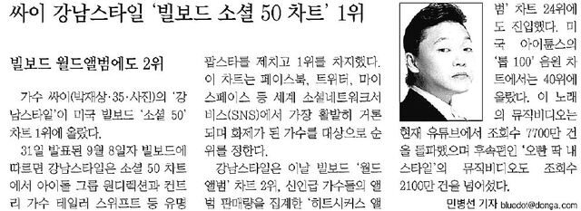 △싸이 강남스타일 '빌보드 소셜 50차트' 1위(동아일보 2012년 9월 1일 25면)