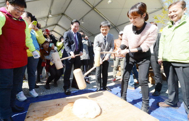 ▲ 18일 전주 월드컵경기장에서 열린'2012 한국음식관광축제'에서 장나라 홍보대사가 전주지역자활센터 부스에서 떡메치기를 하고 있다. 추성수기자 chss78@