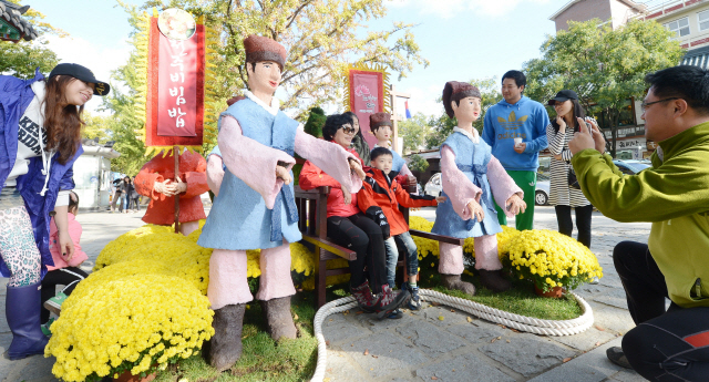 ▲ 전주 경기전앞에서 2012 비빔밥축제를 찾은 관광객들이 대형 토피어리 포토존에서 사진을 찍으며 즐거운 시간을 보내고 있다. 추성수기자 chss78@