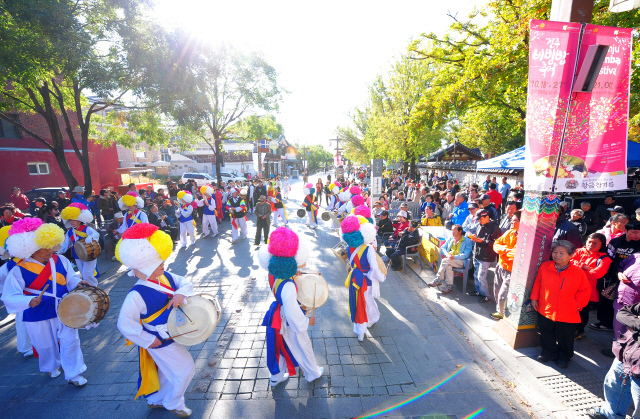 ▲ 2012 전주비빔밥축제가 시작된 18일 전주 태조로 일대에서 농악대들이 신행길 재현 행사를 하고 있다.