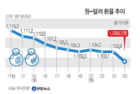 25일 서울 외환시장에서 달러당 원화는 전 거래일보다 5.40원 내린 1,098.20원에 장을 마쳤다.