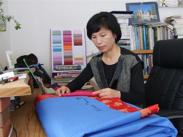 ▲ 호박이 넝쿨 양정숙 대표가 자신이 개발한 오방색 이불 원단에 자수를 입히기 위한 디자인 작업을 벌이고 있다.