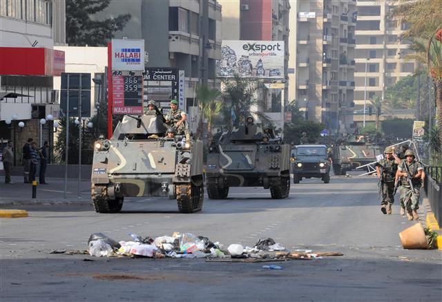 ▲ 레바논 베이루트에서 지난 22일(현지시간) 탱크를 앞세운 무장 군인들이 시가지를 순찰하고 있다. 전날 이곳에서는 차량폭탄 폭발로 사망한 정보당국 수장 위삼 알 하산의 장례식 후 이슬람 수니파와 시아파 무장대원간에 총격전까지 벌어져 최소 2명이 숨지고 수십명이 부상하는 사태가 발생했다. 연합뉴스