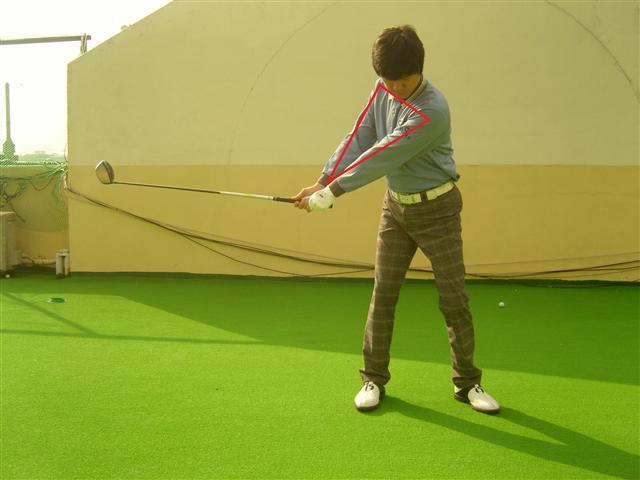 양 어깨와 손 그리고 클럽이 그리는 역삼각형을 그대로 유지해 주는 자세인데 동작은 백스윙의 크기와 비례해서 취해주도록 한다. 사진1은 백스윙 자세이며, 사진2는 팔로우스루 자세이다. 비교해보면 거의 흡사한 동작이란 걸 알 수 있다.