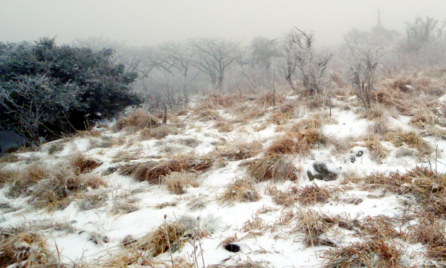 10월의 마지막 날 덕유산국립공원 정상 향적봉에 첫눈이 내렸다. 덕유산국립공원사무소에 따르면 "전날 오후 9시경부터 첫눈이 관측 됐으며, 기온이 영하 5.4도로 떨어지면서 약 3cm의 적설량을 보였다"고 밝혔다. ·사진제공=덕유산국립공원사무소