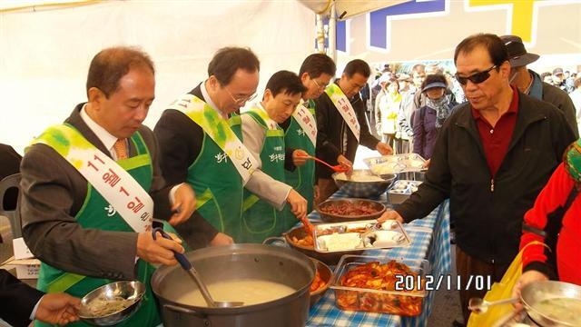 1일 제5회 한우의 날을 맞아 전북도와 농협중앙회 전북지역본부가 마련한 '사랑의 국밥 나누기'행사에서 임정엽 완주군수와 송하진 전주시장, 강종수 전북농협 본부장 등이 배식을 하고 있다. 이 행사는 한우협회 전북도지회 주관으로 3일까지 전주공설운동장에서 진행되며 '암소고기 할인판매' 및 '한우고기 나눔행사'도 열린다.