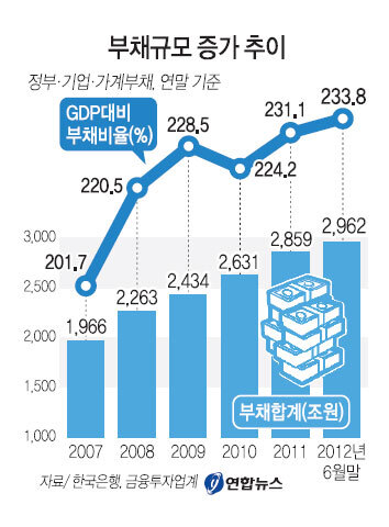 4일 금융투자업계와 한국은행에 따르면 정부, 기업, 가계의 부채 합계는 올해 6월 말 현재 2천962조원으로 명목 국내총생산(GDP)의 233.8%에 달했다.