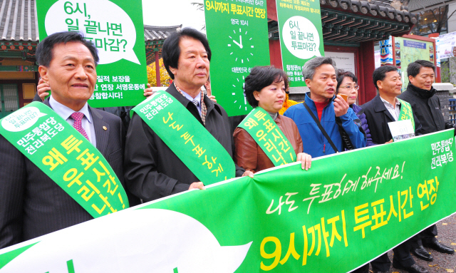 6일 전주 객사앞에서 민주통합당 전라북도당 당원들이 투표시간 연장을 위한 캠페인을 벌이고 있다.