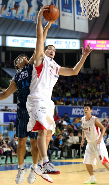 ▲ 내가 잡았다 7일 전주실내체육관에서 벌어진 프로농구. SK 김민수(오른쪽)가 KCC 노승준과 리바운드 볼을 다투고 있다. 연합뉴스