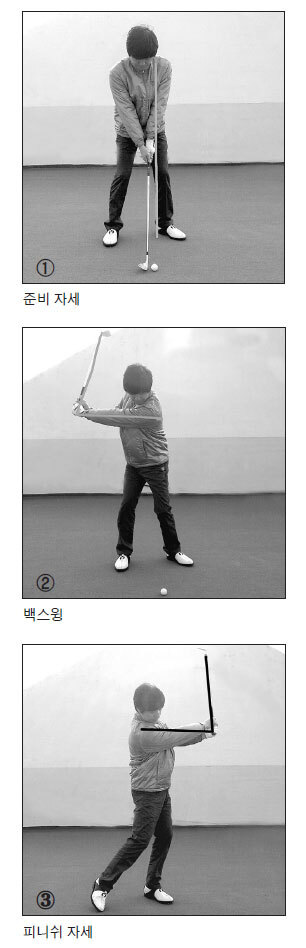 두 번째로는 사진 2와 같이 어깨회전을 최소로 하면서 짧고 가파르게 백스윙을 구사해 양손이 허리 높이 이상을 넘어가지 않도록 한다. 이때 코킹각(샤프트와 왼팔이 이루는 각)이 90도가 되도록 손목을 꺾어주는 것이 중요하다.