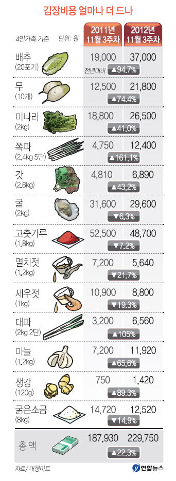15일 유통업계에 따르면 4인 가족이 김장을 담글 경우 김장에 들어가는 비용은 지난해(18만7천930원)보다 22.3% 더 비싼 22만9천750원이 들 것으로 예상돼 주부들의 한숨이 깊어질 것으로 보인다.