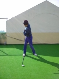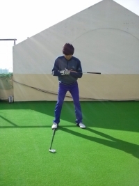 사진 1과 같이 어드레스자세를 취하면서 클럽을 양 팔에 가지런히 놓아 자세를 취한다. 임의 목표를 세우기 위해 오른쪽 발 앞쪽에 이이언이나 볼을 놓아 목표를 만들어준다. 목표의 위치는 어드레스 했을 때 볼이 놓아지는 위치에서 수평으로 오른쪽 발 앞으로 이동해주면 된다. 볼의 위치보다 목표가 너무 앞으로 가거나 안쪽으로 들어가면 몸통 스윙의 회전이 바뀌어 스윙 플레인이 바뀌기 때문에 주의해야 한다.