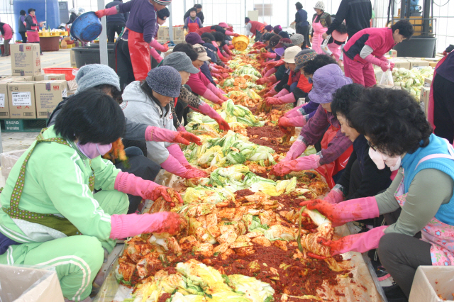지난 19일부터 부안농협 협동조직인(농가주부모임·고향주부모임) 회원 200여명이 참여한 가운데 부안읍 내요리 배추밭에서 배추 5000포기와 무 100 다발을 수확하여 소금으로 절이고 20일에는 배추를 씻고, 양념을 준비하여 숙성을 시켰으며, 21일에는 김장김치를 담아 전달을 하였다.