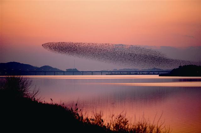 ▲ 금강호의 낙조와 함께 하늘을 수놓은 철새들의 화려한 군무가 장관을 이루고 있다.