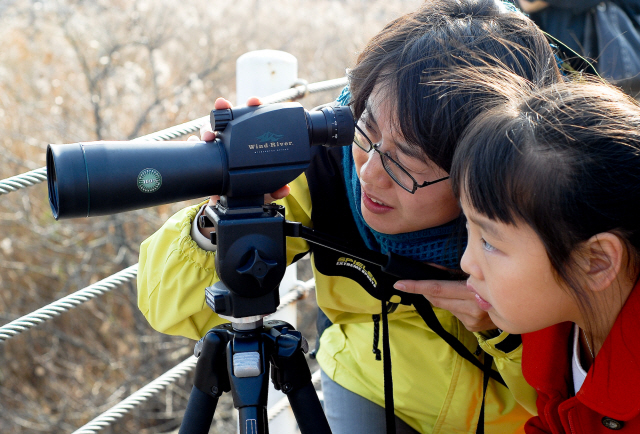 ▲ ? 군산세계철새축제장을 찾은 관람객이 철새를 관찰하고 있다.