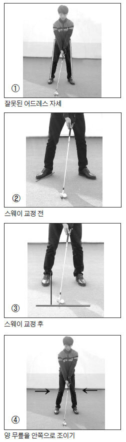 사진2와 3을 비교해보면 다르다는 것을 알 수 있다. 사진2는 교정전의 사진이며, 사진3은 교정후 사진이 된다. 스웨이를 교정하는 구체적인 요령은 우선 양발의 자세를 확인하는 일이다. 스웨이의 주된 원인은 오른쪽발이 오른쪽 밖으로 향하고 있기 때문이다. 이러한 자세는 백스윙 때 체중을 너무 오른쪽으로 이동시키기 때문에 사진3와 같이 오른쪽을 바라보는 발을 자신의 목표선과 직각으로 향하게 왼쪽으로 틀어주면 된다. 이렇게 하면 그 자체로 스웨이가 예방될 뿐만 아니라 어드레스 때 오른쪽 다리가 안쪽으로 조여지기 때문에 백스윙 때 오른쪽 다리를 좀 더 견고하게 유지할 수 있게 된다.