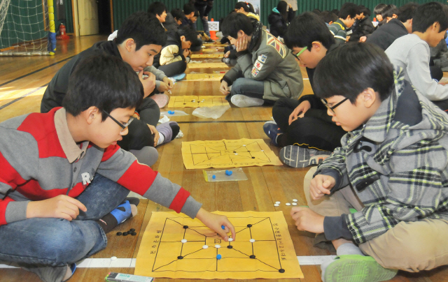 28일 전주 인봉초등학교 강당에서 열린 제6회 에서 학생들이 바둑알을 옮기며 시합을 하고 있다. 고누놀이는 상대방의 말이 갈 곳이 없도록 길을 막아버리면 이기게 된다.