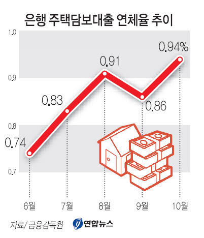 금융감독원은 올해 10월 말 국내은행 주택담보대출의 연체율이 0.94%로 한 달 전보다 0.08%포인트 상승했다고 29일 밝혔다.