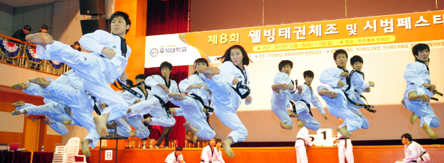 ▲ 2일 무주 예체문화관에서 열린 제8회 웰빙태권체조 및 시범 페스티벌에서 계명대학교 태권도 시범단이 경연을 펼치고 있다. 이강민기자 lgm19740@