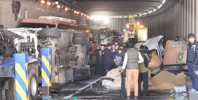 목격자 김모씨(58)는 "사고 차량을 발견하고 다마스 승용차와 시외버스가 멈췄지만 지하차도 내부가 너무 어두워 뒤따라온 화물차가 미처 멈춰 서질 못했다"고 말했다.