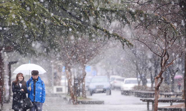 ▲ 전국에 폭설주의보가 내려진 5일 오후 전북대학교에서 학생들이 함박눈을 맞으며 교정을 걷고 있다. 추성수기자chss78@