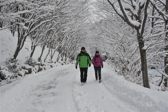▲ 함박눈이 내린 지난 8일 관광객들이 강천산 산책로를 걷고 있다. 사진제공=순창군