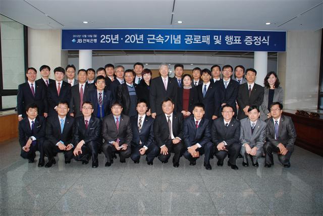 ▲ 10일 전북은행 본점서 열린 창립 43주년 기념식에서 25년·20년 근속기념 공로패를 수상한 직원들이 김한 은행장과 함께 기념촬영을 하고 있다.