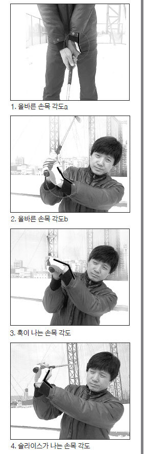 사진3은 손목이 꺾여서 만드는 동작인데, 이 각도의 구질은 훅이 된다. 공이 왼쪽으로 날아가게 되는데, 클럽의 페이스가 닫히기 때문이다. 간혹 슬라이스가 많이 나는 골퍼들이 편법적으로 사용하는 방법이도 하는데, 손목의 목양을 꺾어서는 볼을 똑바로 칠 수 없는 것이다.