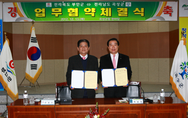 13일 김호수 부안군수와 허남석 곡성 군수는 '부안군-곡성군 문화관광 업무 교류 협약식'을 곡성군청 한마당에서 가졌다.