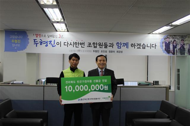 전북은행지역사랑봉사단(공동단장 김한·두형진)은 17일 어린이재단 전북지역본부에 전북 빈곤가정아동에 성금 1000만원을 전달했다.