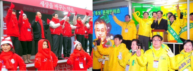 제18대 대통령 선거를 이틀 앞둔 17일 새누리당 전북선대위가 전북대학교 옛 정문 앞에서 박근혜 후보를 지지하는 유세활동을 벌이고 있다(왼쪽). 같은날 민주통합당 전북선대위는 전주시 경원동 관통로 사거리에서 문재인 대선후보 지지를 호소했다.