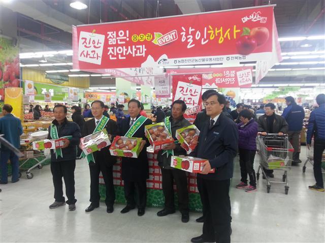 ▲ 18일 진안군 직원들이 농협유통 하나로 클럽에서 진안사과 홍보행사를 펼치고 있다.