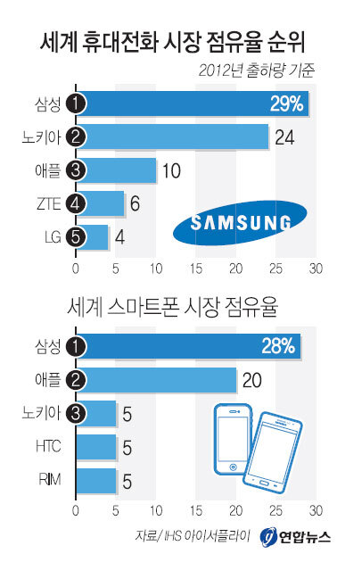 18일(현지시간) 시장조사업체 IHS 아이서플라이의 발표에 따르면 삼성전자는 올해 출하량 기준으로 세계 휴대전화 시장의 29%를 차지, 작년보다 점유율을 약 5% 늘린 것으로 집계됐다.