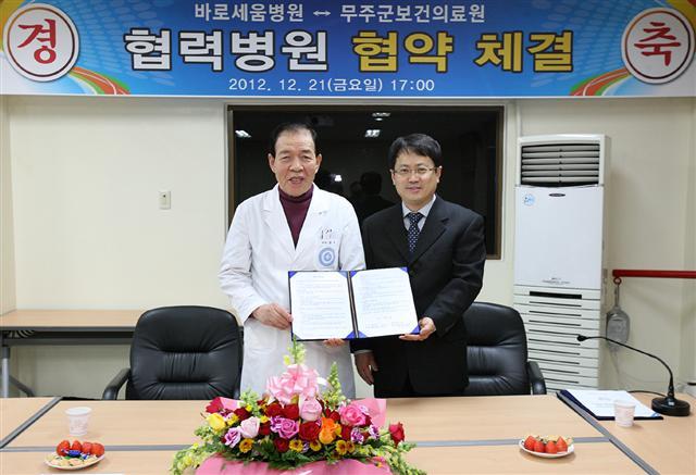 무주군보건의료원(원장 황용)과 대전 바로세움병원(원장 황인석)이 지난 21일 협력병원 협약식을 체결했다. 협약식은 척추, 디스크, 관절 분야의 전문병원인 바로세움병원과 진료 및 교육, 연구 등에 관한 협력관계를 맺어 무주군민들에게 양질의 의료혜택을 제공한다는 취지로 추진됐으며, 황용 원장을 비롯한 담당 공무원들과 황인석 원장을 비롯한 병원 행정관계자 등 10여명이 참석했다.