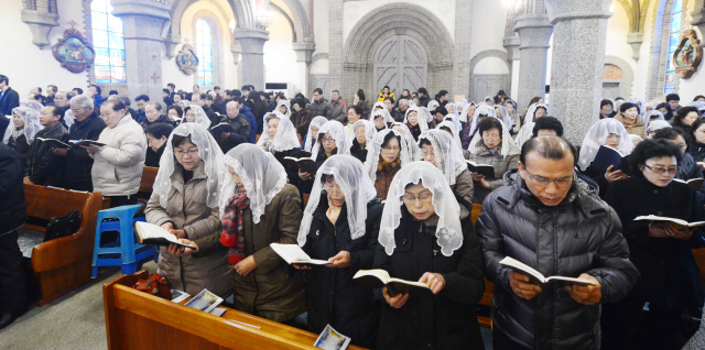 성탄절인 25일 전주 전동성당에서 열린 에 추운 날씨에도 많은 신도들이 성당을 찾아 예수탄생을 축하하는 미사를 드리고 있다.