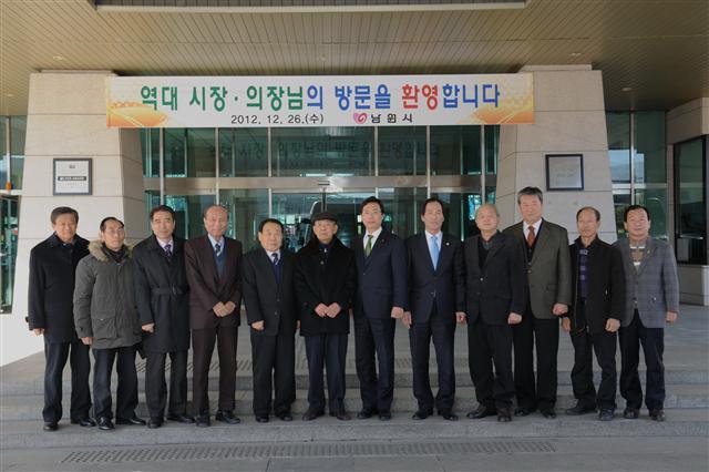 남원시가 26일 시청 회의실에서 '역대 시장 및 시의장 초청 간담회'를 개최했다. 이 간담회는 시정 현안사항에 대해 공유하고 논의하기 위한 자리로, 최봉규 통합전 5대 시장과 김성귀 통합전 시의장 등 13명이 참석했다.