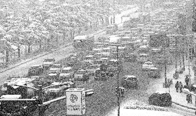 ▲ 전국에 폭설이 내린 28일 전주 종합경기장 사거리의 차들이 도로에 쌓인 눈 때문에 거북이 운행을 하면서 극심한 교통정체를 빚고 있다.