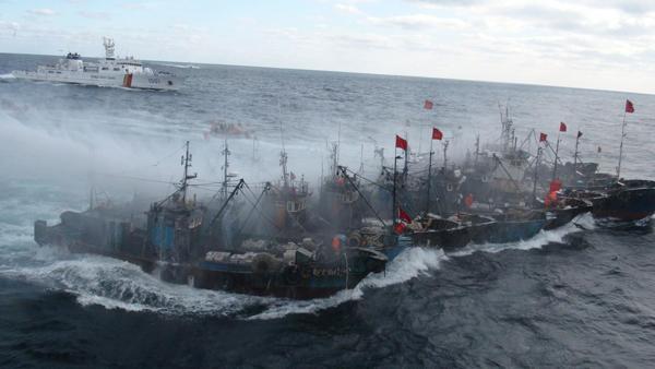 ▲ '연환계'를 형성한 중국어선을 해경 경비함이 소화포를 쏘며 단속하고 있다.