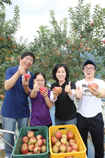 ▲ 무주 무풍사관단지에서 한 가족이 직접 기른 사과나무에서 수확한 열매를 들어보이며 기뻐하고 있다.