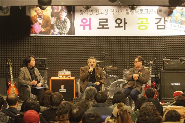 지난 4일 오후 7시 전주 경원동 창작지원센터. 객석에 발 디딜 틈 없이 꽉 찼다. 소설가 황석영(70)·정도상(53)씨가 지난해 대통령 선거 이후 절망에 빠진 독자들을 위해 깜짝 기획한 '위로와 공감'을 주제로 한 북콘서트에는 세대를 넘나드는 다양한 독자들이 찾았다.
