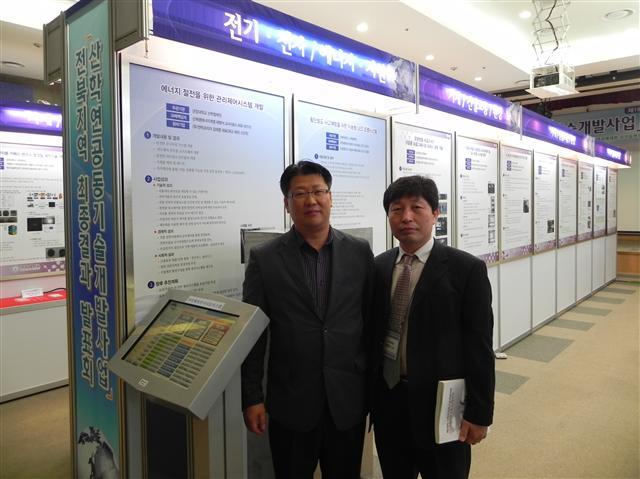 ▲ (유)엔텍코리아 김태명 대표(왼쪽)와 군장대학교 신재생에너지과 채명석(오른쪽) 교수가 공동 개발한 전력관리제어 모니터링 시스템을 설명하고 있다.