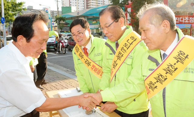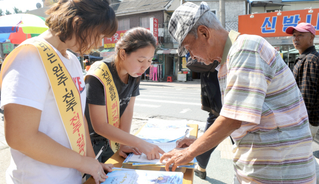 ▲ 전주·완주 통합 민간추진협의회가 전주시민과 완주군민에게 통합 건의 서명부에 사인을 받고 있다. 전북일보 자료사진