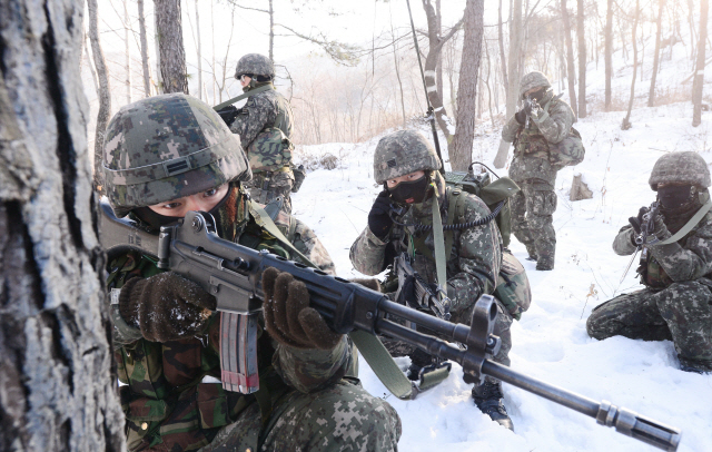 도내 8개 시·군에 한파특보가 발효되는 등 또 다시 맹추위가 기승을 부린 9일 완주군 서방산에서 35사단 혹한기 전술집중훈련에 참가한 장병들이 강한 추위에 맞서 숨은 적을 찾기위해 수색정찰을 하며 60시간(2박 3일) 철야훈련을 하고 있다.