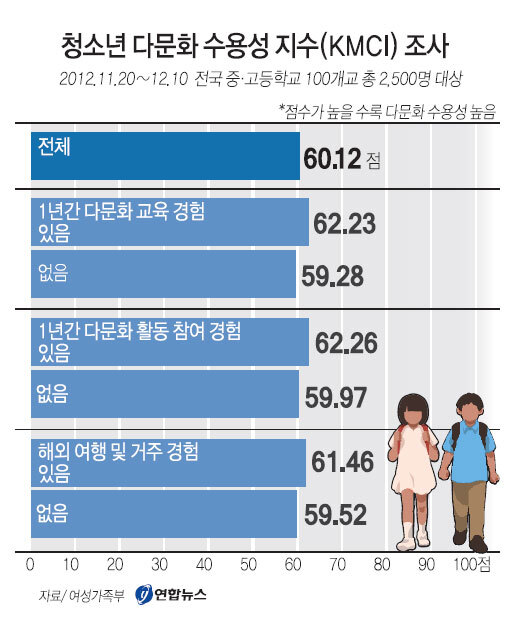 여성가족부는 지난해 11~12월 전국 100개교 중·고교생 2천500명을 대상으로 '청소년의 다문화 수용성'을 처음 조사한 결과, 수용성 지수(KMCI)가 60.12로 나타났다고 15일 밝혔다.