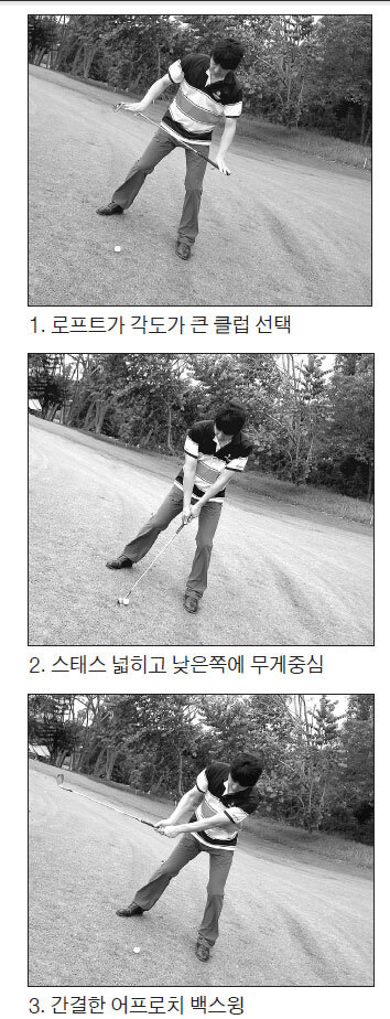 따라서 어프로치 후 공이 날아가 바운스를 한 뒤 공은 굴러가는 것을 상상하고 어프로치의 거리와 스윙의 크기를 결정해야한다. 물론 공이 많이 뜰 수 있게 로프트가 큰 클럽을 고르는 것은 기본이다.