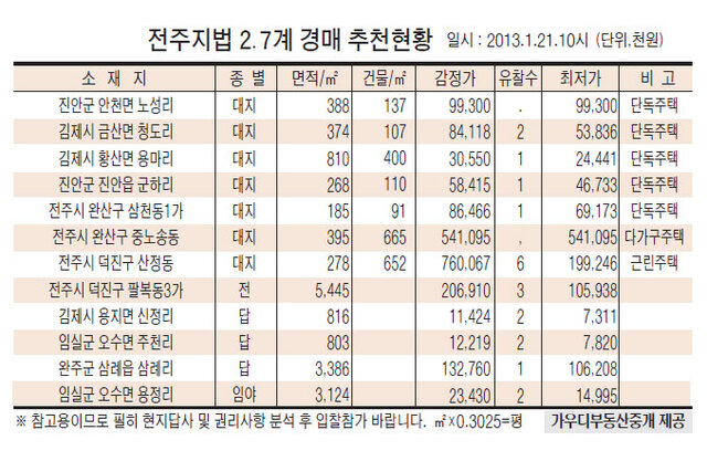 △완산구 중노송동 다가구주택=본건은 우성해오름아파트 남측 인근에 소재하며, 부근은 아파트단지, 단독주택, 다가구주택, 상가 등이 혼재하는 지역이다. 차량의 출입이 가능하고, 인근에 간선도로와 시내버스 승강장이 소재하는 등 제반교통 여건은 양호한 편이다. 사다리형 평지의 주거용 건부지로서 동측 및 남측으로 아스팔트 포장도로와 접해있으며, 용도지역은 제2종일반주거지역, 지구단위계획구역, 소로3류, 상대정화구역이다. 건물의 구조는 철근콘크리트조 철근콘크리트지붕위 판넬지붕 3층건의 다가구주택으로 이용 중이며, 급·배수설비 및 도시가스에 의한 개별난방 시설이 되어있다.