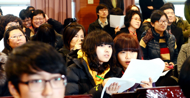 16일 전북도교육청 중회의실에서 열린 2013학년도 고입선발시험 합격자 학교 배정 공개 추첨에 참석한 학생과 학부모들이 모니터를 지켜보고 있다.