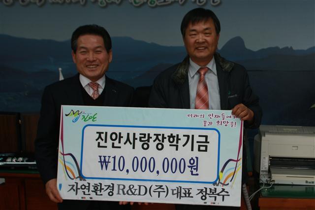 경기도 안양에 본사를 두고 있는 (주)자연환경 R&D 정복수 대표는 지역인재 양성에 써 달라며 지난 18일 진안사랑장학재단에 1000만원을 쾌척했다.