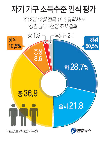 21일 보건사회연구원의 '미래 보건복지 방향설정과 정책개발에 관한 연구보고서'에 따르면 작년 12월 전국 16개 광역시.도의 성인 남녀 1천명을 조사한 결과 50.5%가 자기 가구의 소득 수준이 중간 미만이라고 평가했다. 중간 정도라는 대답이 36.9%였고, 10.5%는 스스로를 소득 상위층으로 인식하고 있었다.
